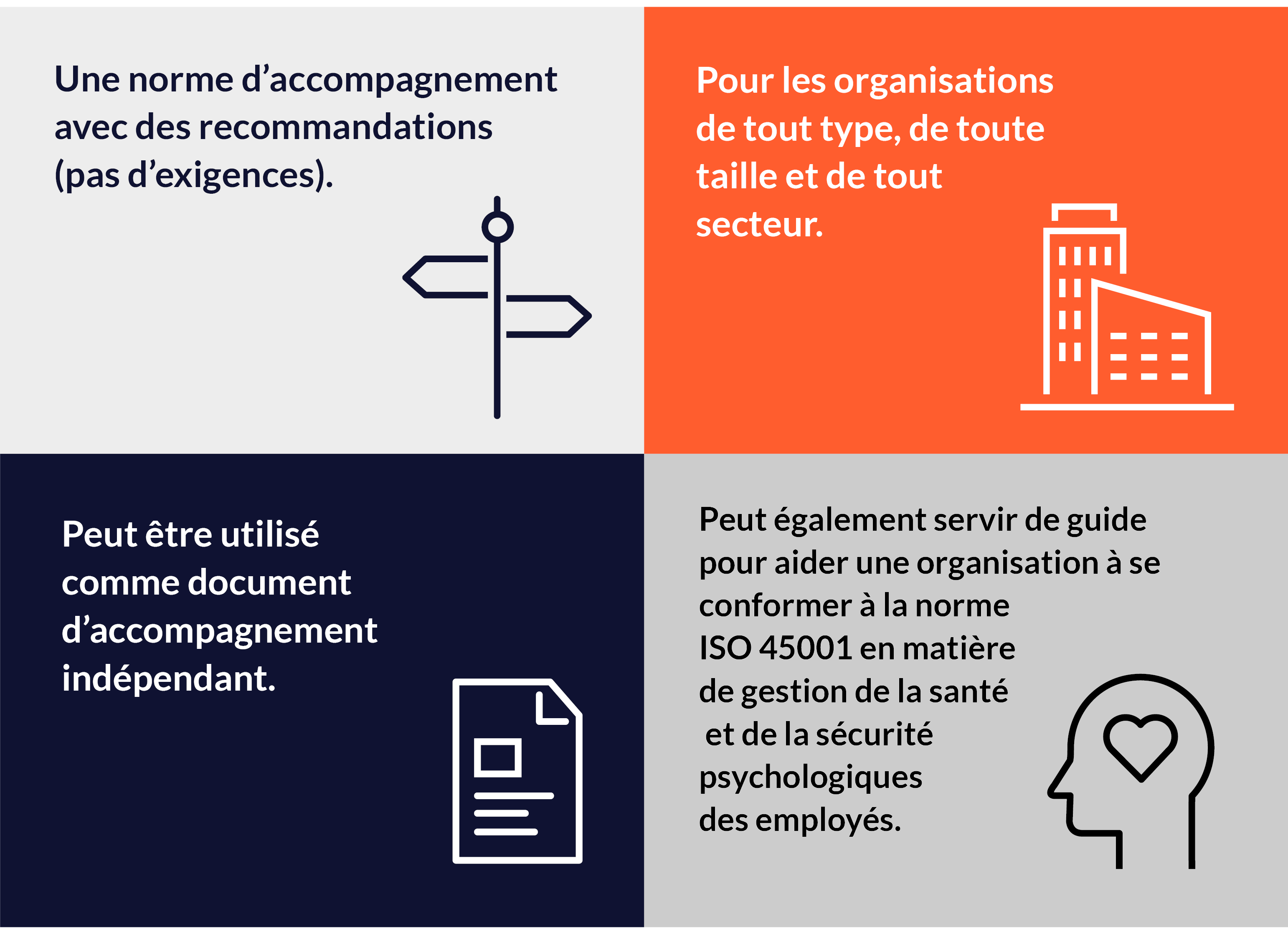 Publiée en 2021, la norme ISO 45003 est la première norme internationale dans le domaine de la santé mentale, de la sécurité et du bien-être au travail. ISO 45003 est une norme d'orientation contenant des recommandations (et non des exigences) destinées aux organisations de tout type, de toute taille et de tout secteur. Elle peut être utilisée comme document d'orientation autonome ou comme guide pour aider une organisation à se conformer aux exigences de la norme ISO 45001 en matière de gestion de la santé mentale et de la sécurité des travailleurs.